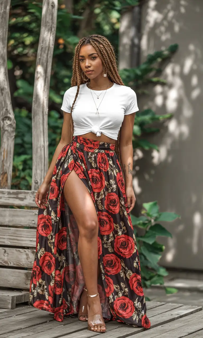 A white knotted shirt is paired with a black flowy maxi skirt with a red rose print and a dramatic slit. This outfit has the qualities of both freedom and boldness to create summer vibes that would make any garden event or Japanese-inspired photo shoot pop. The outfit is finished with a polished touch through small accessories and heels SANDALS. The aesthetic fashion style effortlessly combines women’s streetwear elements with charming appeal.