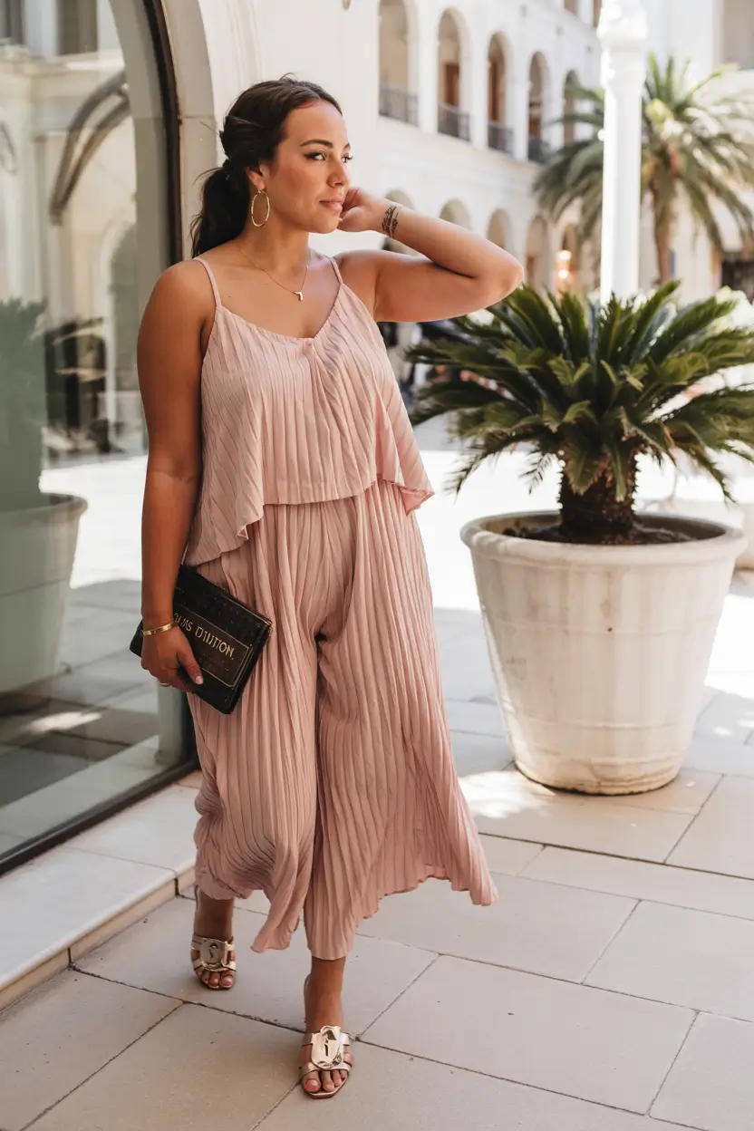 The blouse-colored pleated jumpsuit functions as an unadulterated declaration of comfort and fluidity. The layered top of the outfit creates a dynamic movement that meets the wide legs that create flattering lines for bodies of all shapes. The combination of metallic sandals with a matching dark clutch creates a stunningly understated resort look for dining out or traveling in Spain. The outfit establishes the refined essence of soft luxury for curvy looks in the Summer 2025 trends.