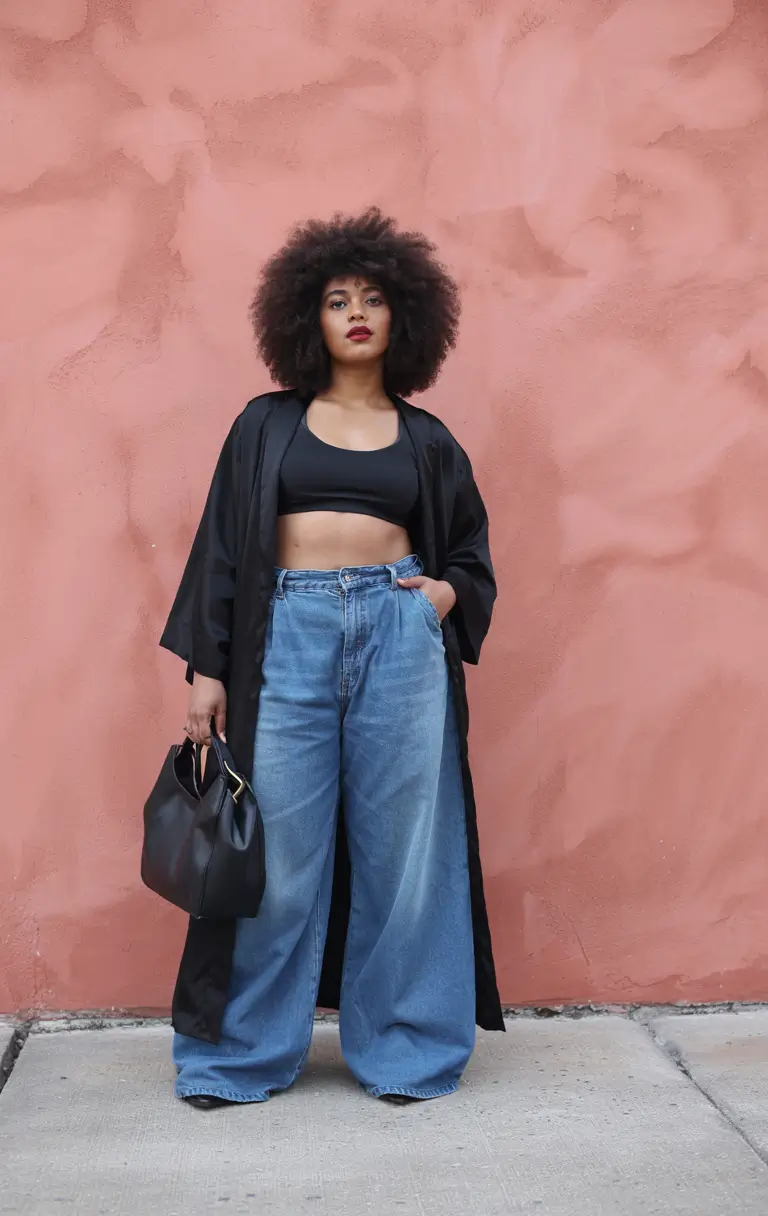 The urban women’s streetwear ensemble combines wide-legged, high-waisted jeans with a tight-fitting black crop top. The combined elements of this ensemble format include a long black lightweight coat that acts as a structural element and provides bold layering effects. The outfit works perfectly for artsy Japanese-style photo shoots or current school hangouts. This effortless style combines curvy outfit ideas for summer 2025 that effortlessly balance comfort with confidence in design.