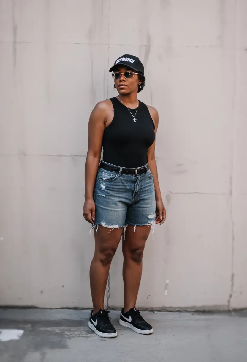 The casual black tank bodysuit meets high-rise denim shorts with belt and black caps. The black belt creates a neat appearance and shares the color scheme with the matching sneakers and cap to create a complete casual streetwear outfit. This outfit works well for casual college life or state fairs. This outfit functions as contemporary clothing built for sporty female fashion.