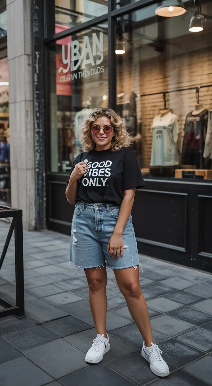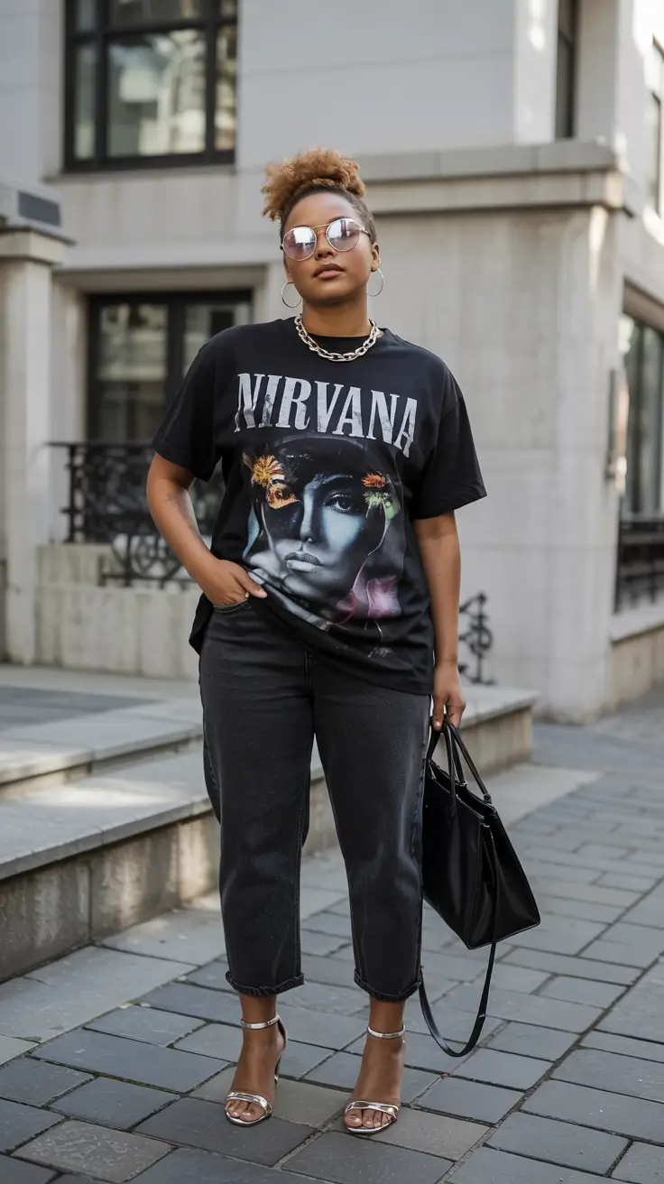 An oversized Nirvana graphic tee is effortlessly paired with black denim rolled into straight legs. Block-heeled sandals with metal construction are paired with a chunky gold chain to contrast with the muted colors. The outfit works both as a hip choice for a downtown coffee bar and as a casual style for strolling the streets of London. The Summer 2025 fashion trend creates a bold, casual spirit in its selection of curvy outfits that celebrate streetwear fashion for women.