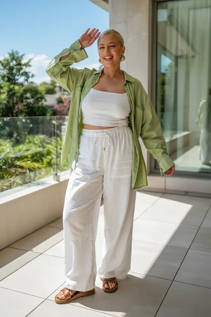 Two pieces of crisp white create the ultimate muted palette outfit when paired with wind-resistant white wide-leg drawstring pants. The outfit is perfect for both summer days and school events when the button-down shirt is worn open at the waist. The woven platform sandals enhance the outfit by providing a natural texture that does not dominate the ensemble. The collection of curvy outfits for summer 2025 would be enriched by this cool and simple outfit.
