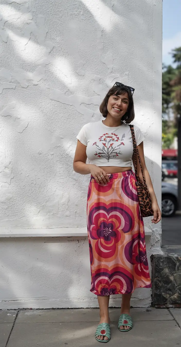 This cheerful outfit features a white floral top that hits above the waist and is paired with a swirling hot pink and orange midi skirt. The skirt features retro patterns for an eye-catching look, while green slippers add a whimsical touch to the outfit. The leopard-print shoulder bag brings fun to state fairs and carnivals. An expressive look with boho-chic energy and retro flair.