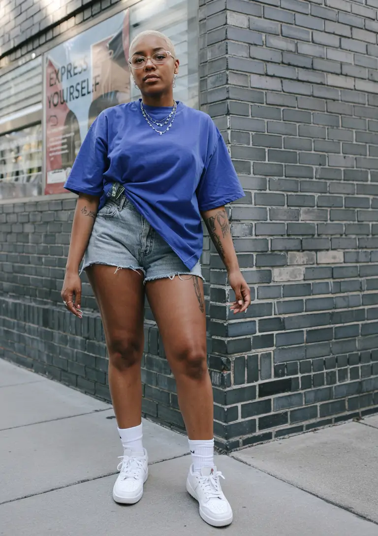 An oversized blue t-shirt worn as outerwear looks casual and comfortable when tucked into tailored high-rise denim shorts with frayed edges. A casual Korean-inspired street style look is completed with white sneakers paired with crushed socks. The fit works well for urban creative activities as well as academic situations at the university. This outfit portrays expressive women’s streetwear in a way that is both cool and confident.