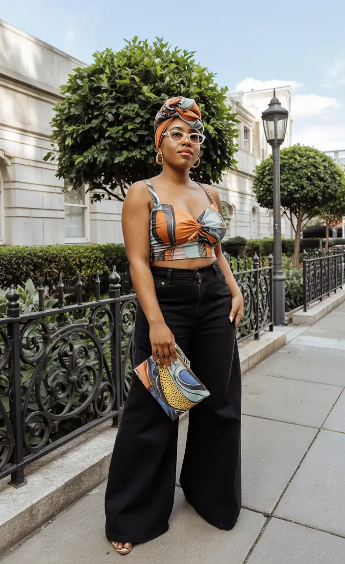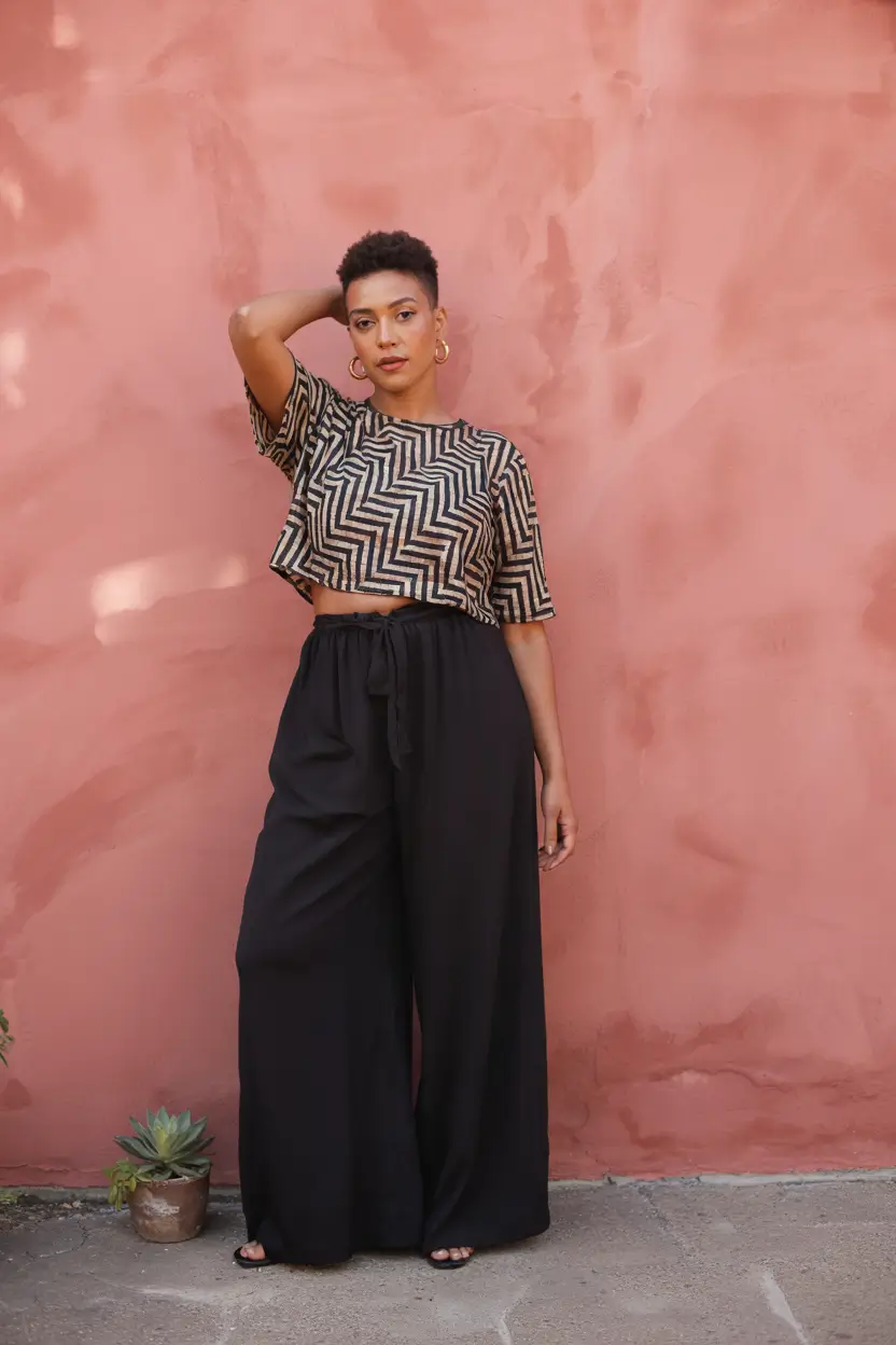 A stylish outfit statement is made with a boxy chevron crop top paired with loose black wide leg pants. The waist of these pants falls slightly due to the loose tie closure, creating a relaxed yet sophisticated look. This outfit works effectively as an evening rooftop choice and a day at the gallery requires muted tones. The outfit shows boldness through its stylish design, but maintains a modest look that enhances all the curvy outfits of summer 2025.