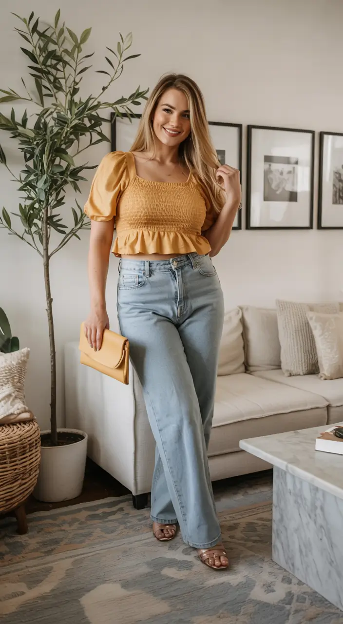 #25 Mustard Puff Sleeve Top and Wide Leg Denim