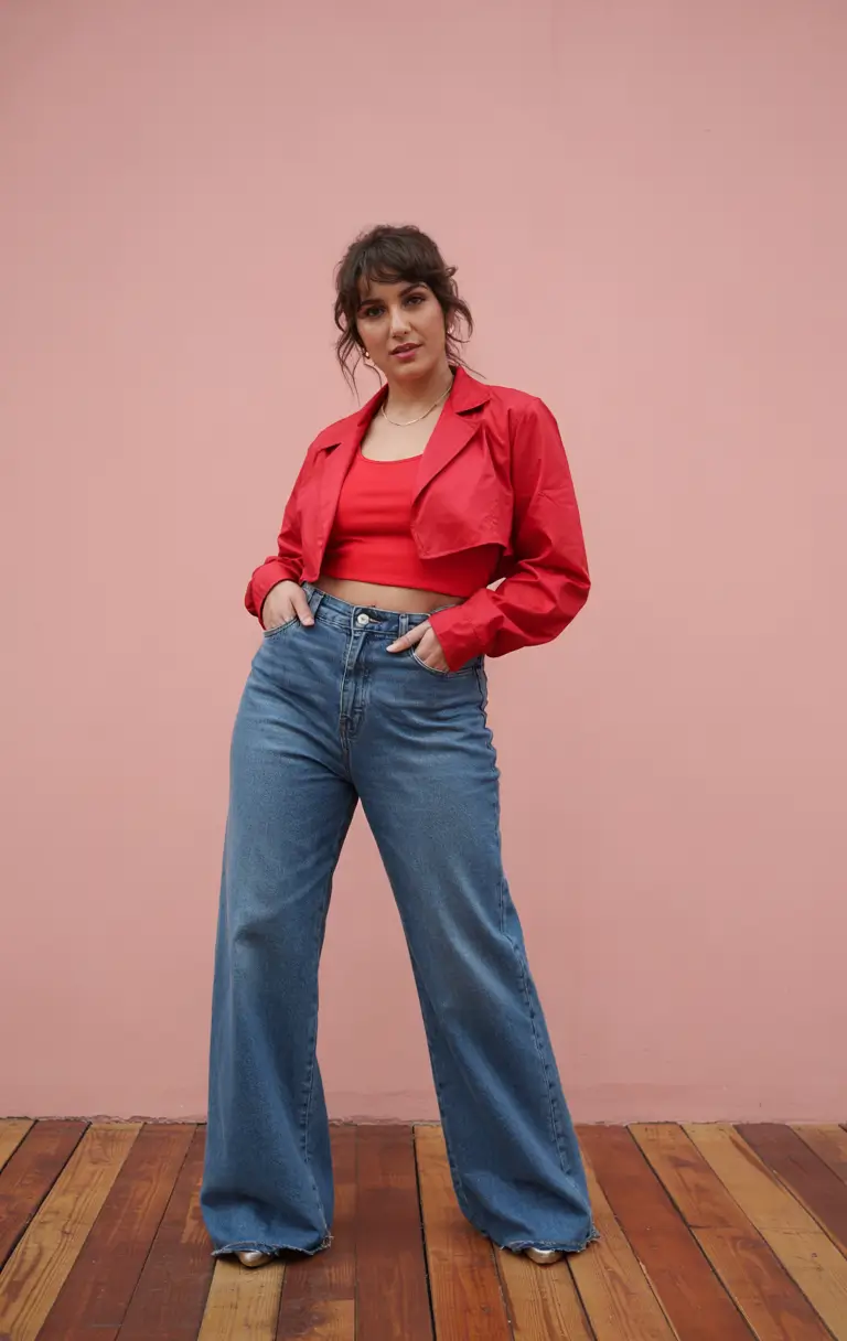 A bold red cropped jacket dominates this outfit as it sits on top of an identical red cropped top. The combination creates a vintage appeal by expressing confident curves while wearing loose, wide-legged denim. This structural design allows the top to work well with the skinny jeans to create looks suitable for evening events and city strolls. This outfit is one of the more sophisticated curvy dress concepts for Summer 2025.