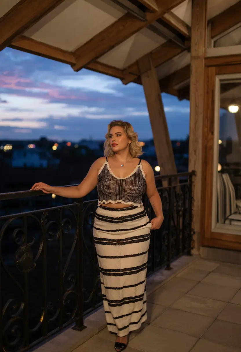 A combination of two pieces in black and white stripes creates a soft and elegant nighttime vibe. A maxi skirt with a fitted design shows a smooth shape and is paired with a small knit top with small straps. The outfit features textured fabrics alongside muted tones that are suitable for more subtle evening occasions. The fusion of understated glamour with the curvy patterns of summer 2025 is beautifully illustrated in this outfit example.