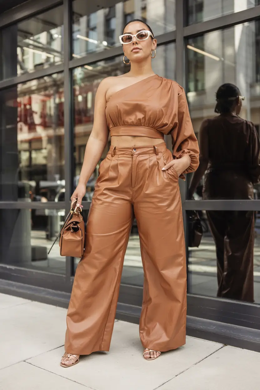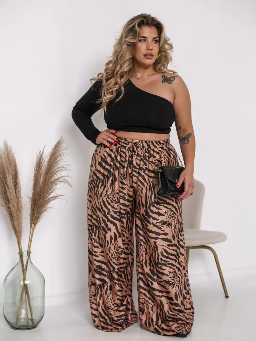 This outfit combines a black one-shoulder crop top with a pair of wide-legged pants in an aggressive animal print. This ensemble creates a confident silhouette as the pants fall with ease, while the top adds powerful structure and fashion appeal. Such a stylish combination provides both an energetic vibe for parties and a forward-thinking style for fashionable events. Powerful women’s streetwear with a sophisticated twist that still feels fun and aesthetic.