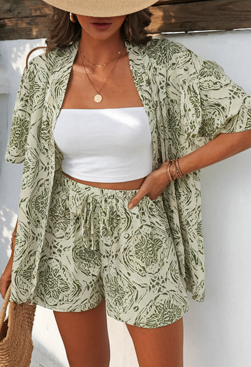 This black and white zebra print set is a striking option for vacation fashion. The look features loose drawstring shorts paired with a matching open-front kimono, creating a flowy and relaxed silhouette. Underneath, a simple black triangle bikini top keeps the outfit balanced and stylish. Delicate gold layered necklaces and bracelets add a touch of elegance to this statement-making beachwear look.