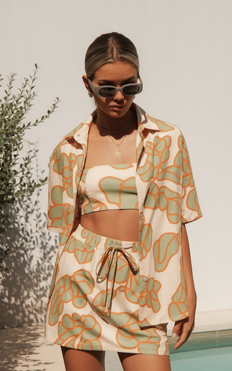 This printed two-piece set brings a contemporary twist to resort wear summer dresses. The bandeau-style crop top and drawstring mini skirt create a youthful and trendy look, perfect for a casual summer outfit. The oversized short-sleeve button-down shirt, featuring the same orange and green abstract print, adds a breezy layering option. Styled with rectangular sunglasses and simple gold jewelry, this set is ideal for a modern vacation wardrobe.