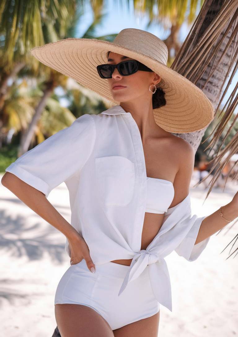 This all-white beach set is a timeless and elegant choice for a summer trip. A strapless bandeau bikini top is paired with high-waisted bottoms, creating a sleek and flattering silhouette. A loose white button-down shirt, casually tied at the waist, adds a chic layering piece. A wide-brimmed straw hat and oversized black sunglasses complete this effortlessly glamorous resort wear look.