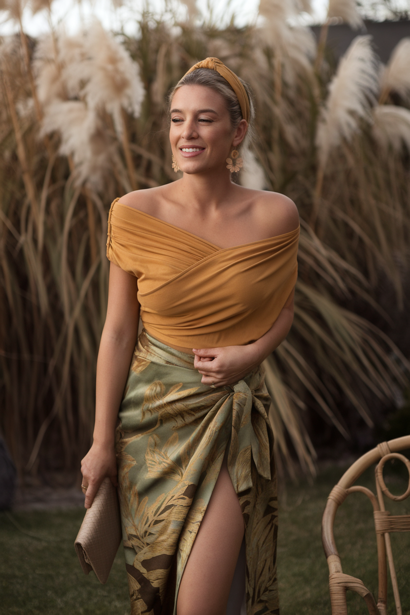 This sophisticated vacation outfit features a mustard off-shoulder crop top with delicate draping for a refined touch. The high-slit printed sarong in green and gold tones adds an effortless elegance, perfect for a sunset dinner by the beach. A matching fabric headband brings a cohesive element to the look, while floral statement earrings and a neutral clutch bag provide the perfect finishing touches.