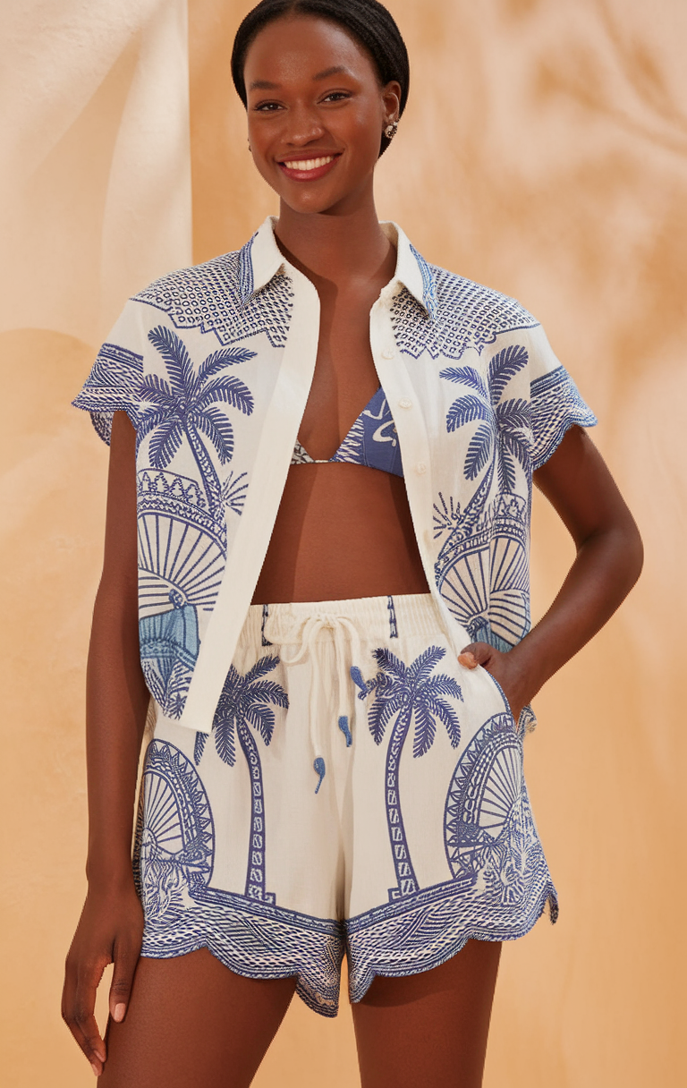 This breezy two-piece set features a short-sleeve button-down shirt and scalloped hem shorts, both adorned with a blue palm tree and fan print. The lightweight fabric makes it a perfect choice for warm weather, offering both comfort and style. A matching blue bikini top adds a cohesive touch, making this look effortlessly vacation-ready. Simple pearl earrings complete this fresh and relaxed beach ensemble.