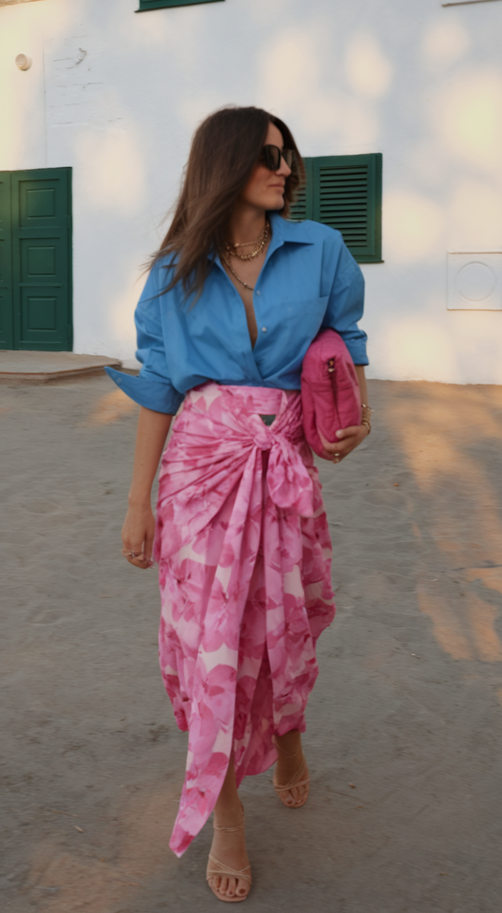 For an elegant dinner or modest yet stylish dress for a beachside stroll, this outfit blends sophistication and comfort. A bright pink floral sarong is tied at the waist, paired with a structured blue button-down shirt for a classy contrast. The vibrant colors add a playful touch, making this a standout option for ideas summer or a summer trip. It’s a versatile pick for curvy women who want a polished yet relaxed resort wear summer dresses look.
