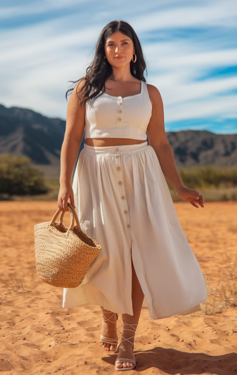 This white crop top and high-waisted skirt set offers a sophisticated take on casual resort wear summer dresses. The structured button-down front and breathable linen fabric make it a stylish yet comfortable choice for a holiday by the sea. The flowing midi skirt adds movement, while the matching top flatters the figure with a tailored fit. Paired with strappy sandals and a woven beach bag, this look is a perfect blend of relaxed and polished vacation style.