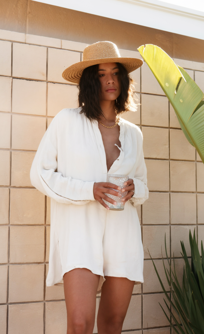 This oversized white shirt dress is a timeless and versatile choice for a summer trip. The lightweight fabric and loose fit provide a relaxed yet polished look, perfect for warm beach days. A structured straw hat adds a stylish touch while protecting from the sun. The outfit is completed with a delicate gold chain necklace, keeping the look simple yet elegant.