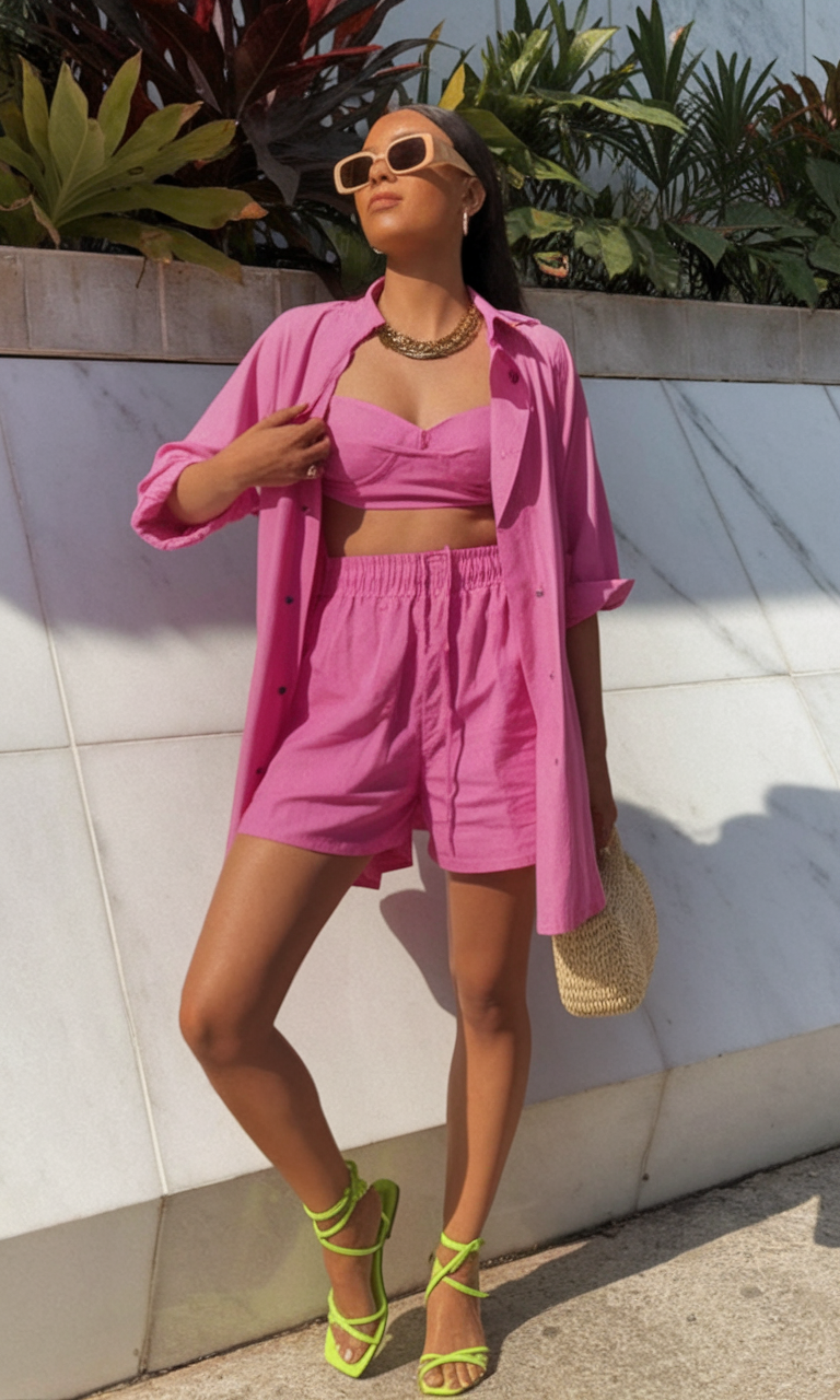 This vibrant pink two-piece set is a standout choice for resort wear summer dresses. The look features a structured crop top paired with high-waisted elastic shorts, creating a flattering silhouette. An oversized button-down shirt in the same bold hue adds a casual yet polished touch. Styled with lime green strappy heels and neutral-toned sunglasses, this outfit is a fresh take on vacation fashion.