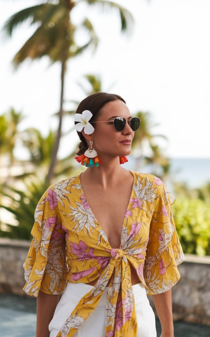 This floral yellow blouse brings a bright and airy feel to a summer trip wardrobe. The tie-front detail and flowy sleeves give it a relaxed yet feminine look, ideal for beachside strolls or a casual dinner. Paired with crisp white high-waisted pants, this outfit achieves a balanced mix of casual and elegant. Colorful tassel earrings and a flower hair accessory complete the resort-ready aesthetic.