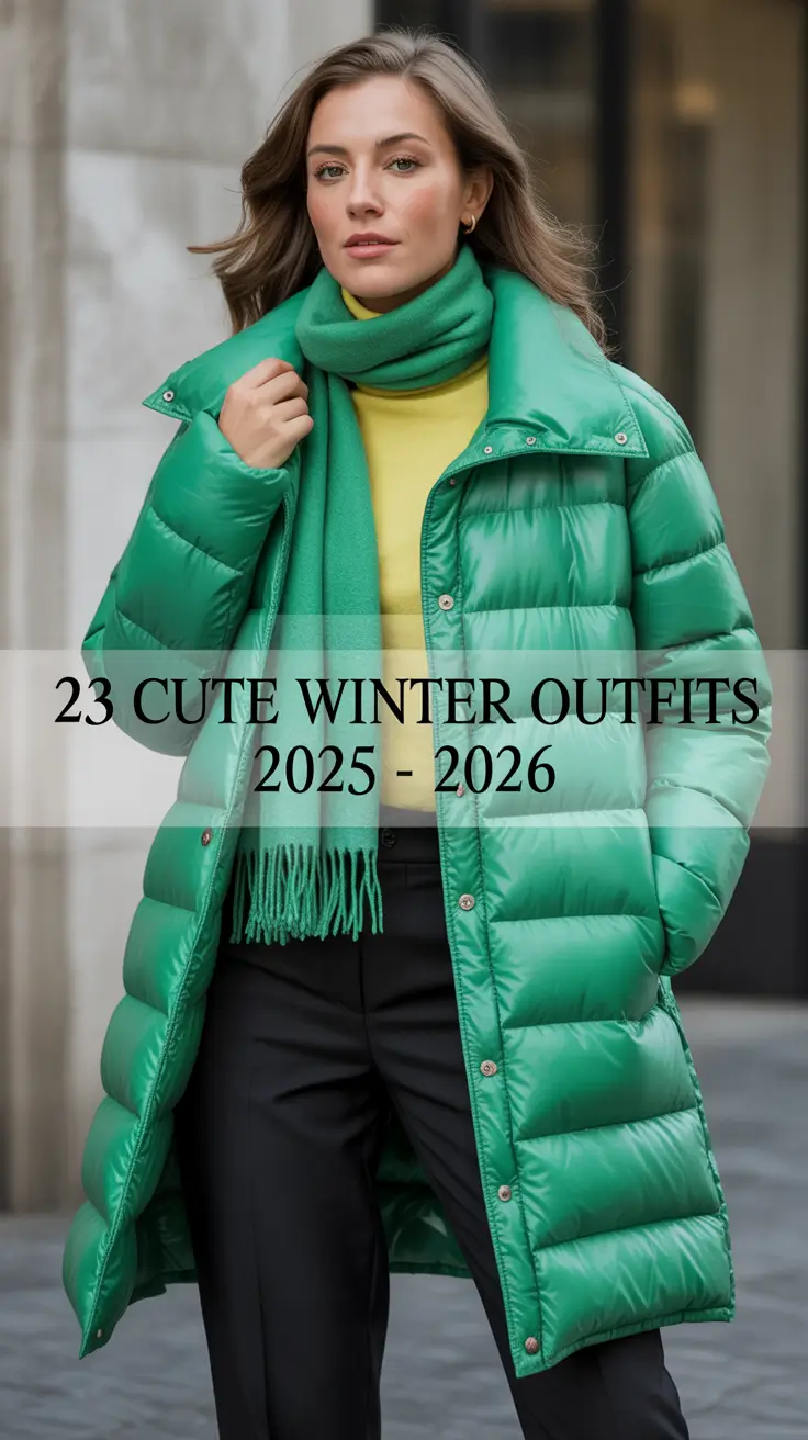 Winter outfits are not necessarily supposed to be based on dull colors. At times, even going out in a bright pop of color is a way of asserting yourself. The green puffer with a glossy look, which is worn on top of a turtleneck and a matching scarf is an excellent idea of how to go out there even when it is freezing without worrying about being frozen. It is an inspiration on the days when you need to look comfortable, yet you do not want your style to pass unnoticed.