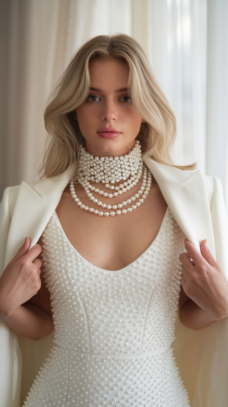 This white gown features intricate pearl embellishments, offering a luxurious texture and stunning visual detail. The deep neckline is complemented by a layered pearl choker, adding an opulent touch. Finished with a crisp white blazer, this nice and formal ensemble is perfect for a Christmas evening, team dinner, or steak night, showcasing a modern take on elegance.