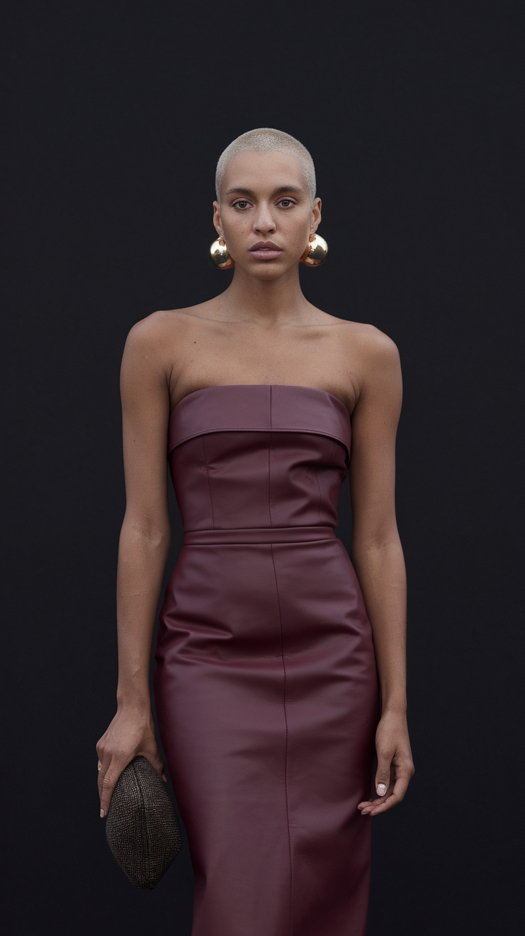 This strapless burgundy leather midi dress combines boldness with sophistication. The structured bodice and clean lines create a classy and formal appearance, perfect for a Christmas evening or a fall anniversary. Paired with oversized gold earrings, this outfit embodies modern dinner outfits ideas 2025 with a luxurious edge.