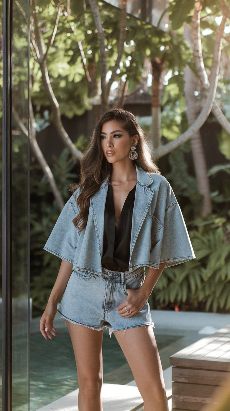 This casual yet stylish look features a cropped denim jacket paired with high-waisted denim shorts. A silky black blouse underneath adds a dressy casual touch, making this outfit ideal for a summer night casual dinner or a friends’ birthday celebration. The blend of textures creates a cute yet polished ensemble perfect for relaxed occasions.