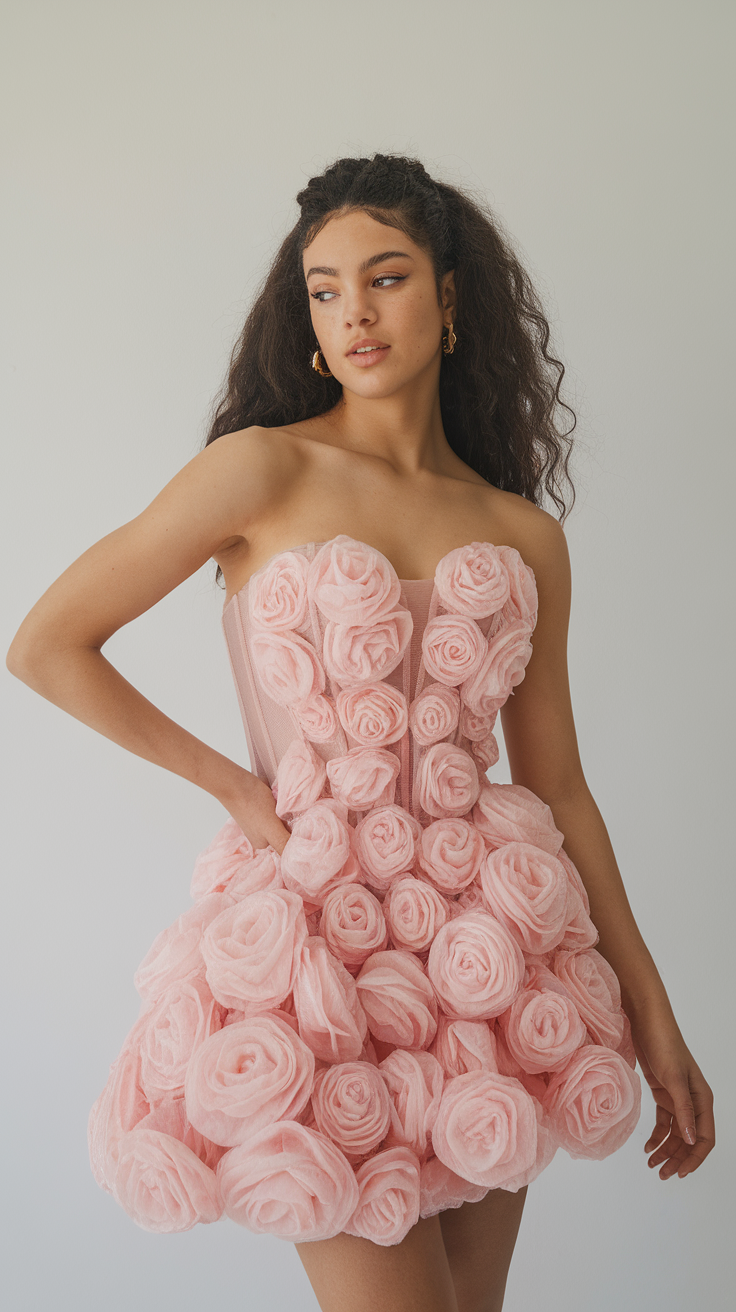 This strapless pink mini dress adorned with voluminous rose appliques is a playful yet cute choice for a friend’s birthday or summer night casual dinner. The structured bodice and whimsical floral details make this outfit perfect for those looking to stand out with elegance and charm.