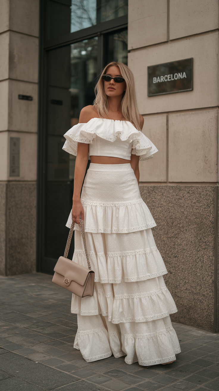 An all-white two-piece ensemble with delicate eyelet detailing is both fresh and sophisticated. The off-shoulder top and tiered skirt make it a cute and elegant choice for a summer night dinner or an evening group outing. This dressy casual look is perfect for a fall anniversary, a steak night with friends, or even a semi-formal team dinner.
