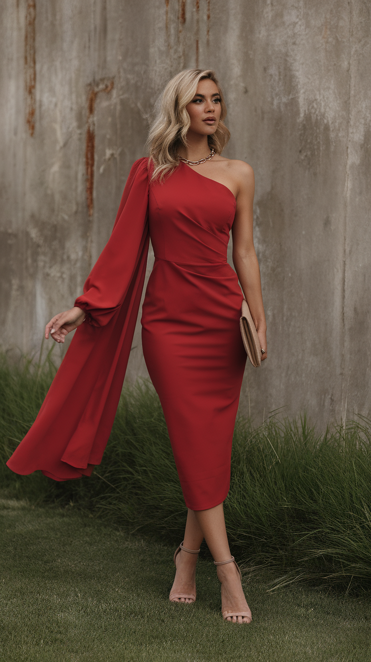 A sleek, one-shoulder red midi dress featuring a dramatic cape sleeve adds a touch of high-end glamour to any event. The tailored fit and clean lines of this dress make it perfect for a formal Christmas evening or a fall anniversary celebration. Its bold hue and elegant design are ideal for a classy dinner outfits ideas 2025, whether for a steak night or a romantic evening.