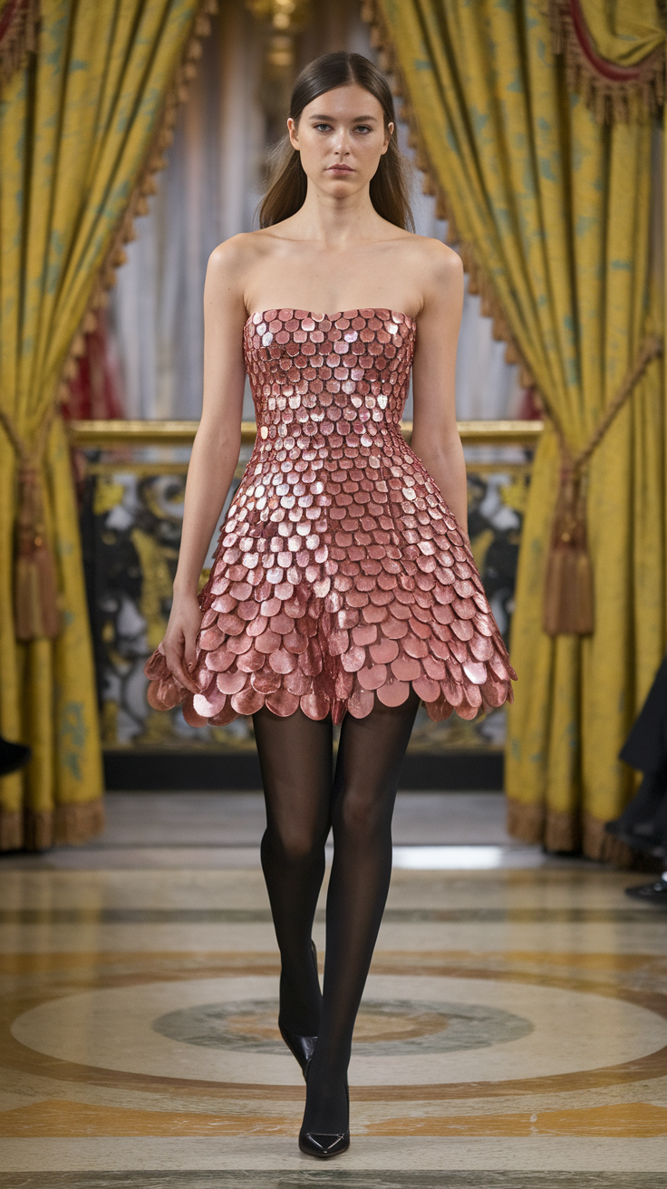 A strapless rose gold mini dress with shimmering, scale-like detailing creates a playful yet elegant look. The fitted bodice and flared hemline add a youthful charm, making this outfit perfect for a friend’s birthday or a summer night casual dinner. Its reflective texture and cute silhouette make it a standout choice for a fancy evening or a group celebration.