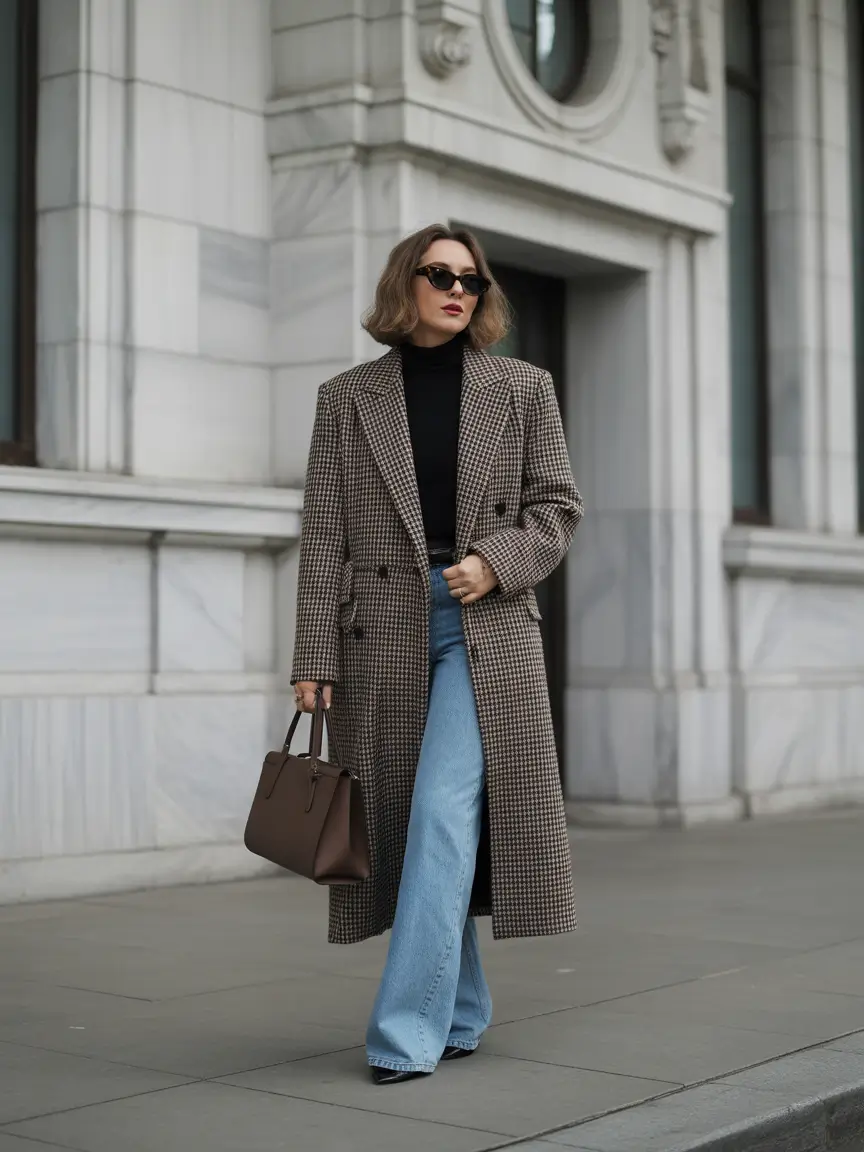 It is hard to deny the fact that a combination of a long houndstooth coat with wide-leg denim and pointed boots is something sharp. It’s giving confidence. The blazer is slightly oversized but not too stiff, and that makes it one of the simplest concepts 2025 to follow in case you want to take charge of a room or your commute. The silhouette is so soft, it alludes to the tailoring of the 70s but is very much in the present.