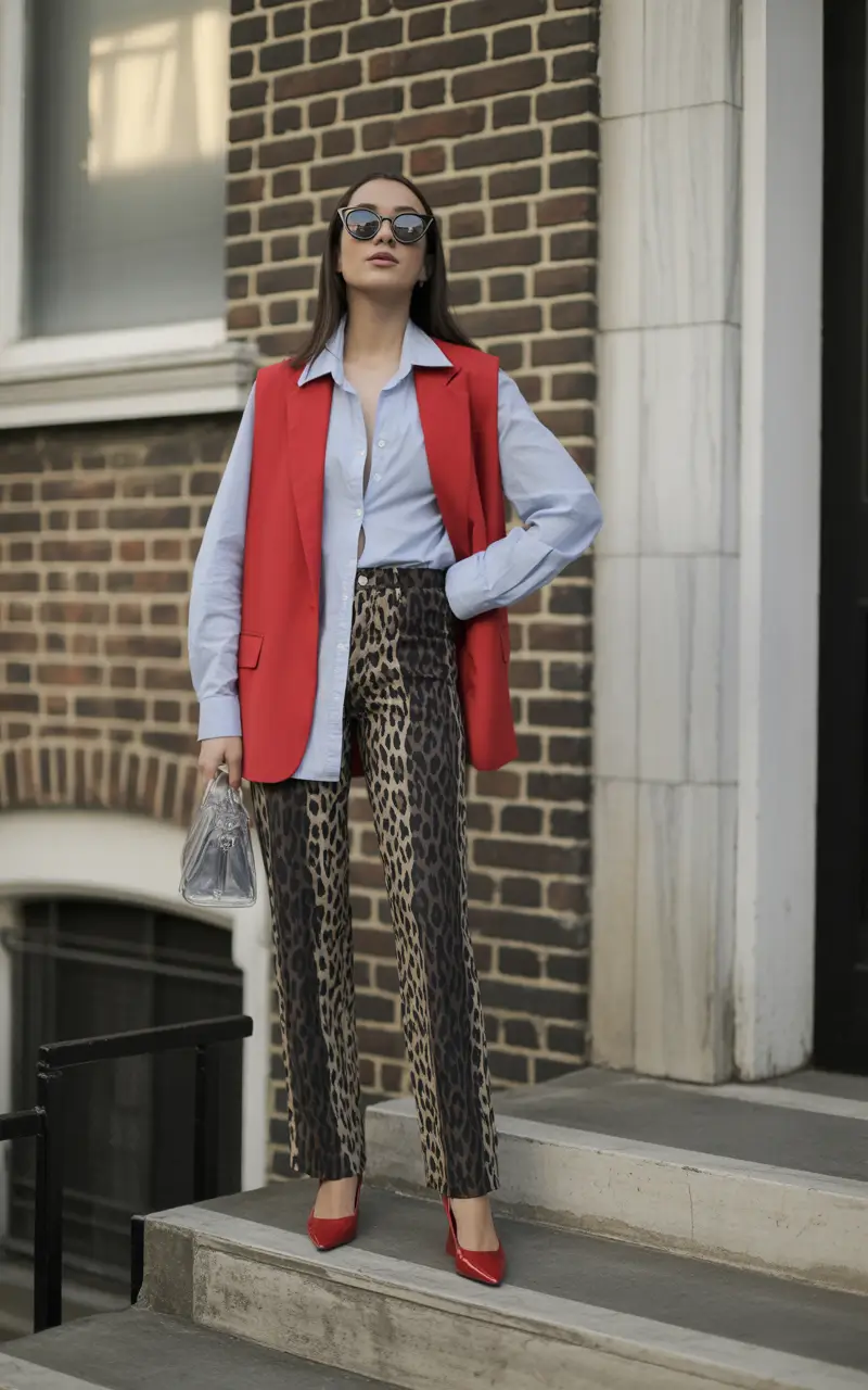 This is evidence that fashionable fall clothes do not have to be subtle to be sophisticated. This outfit goes bold with patterned leopard trousers, a red vest (very fall 2025), and a sky-blue button-down that reins it all in. I am in love with the way red heels ground everything, this is inspiration all over.