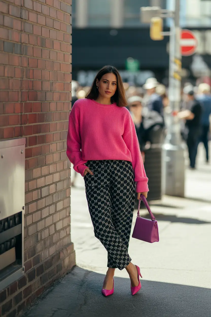 Let’s break it down: The oversized sweater adds volume and comfort (hello, cozy office vibes), while the printed trousers keep things grounded. The heels? They’re classic pointed-toe pumps with a 2025 primavera twist — matching the bag in electric pink. This you might completely imitate with any combination of print-on-bottom and bold-on-top. Extra marks when the accessories are also in the same colorful language.