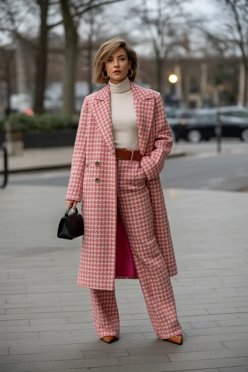 Let’s take a moment for this pink-on-pink power move. A houndstooth wool coat over a matching trouser is not a statement that you have to scream about. It has a retro vibe, like Jackie O and 2025 street style, but with a contemporary-day belt clinch and sleek turtleneck layering underneath. With the loose bulk of the coat and the formal cut of the pants, it is casual chic with a political bend. She’s not running for office — she’s redesigning it.