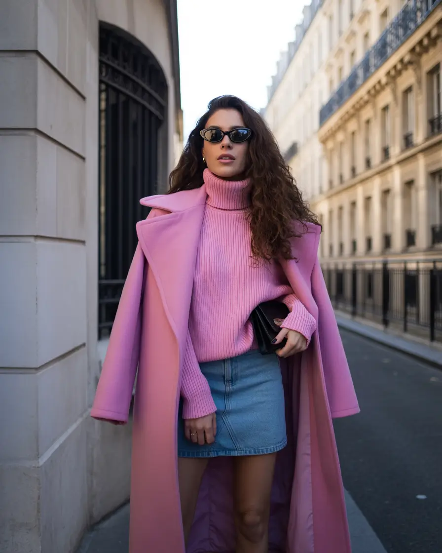 This look will show you that pink is powerful even during colder months in case you have ever doubted it. A large pink turtleneck worn under a longline blush coat brings the marshmallow softness that we all desire when the air becomes crispy. It is equalized with a traditional denim mini skirt and a chic black clutch, so it is both a street-style and an après-ski dream. This is the atmosphere of all teens 2025 moodboards and a Pinterest board in the making.