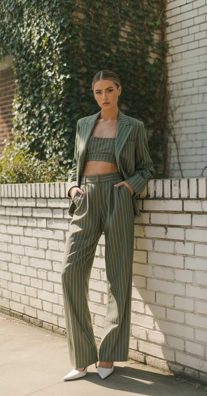 Gen Z glow-up of tailoring would be like this. A matching blazer and high-waisted pants in olive green pinstripes, with a cropped bandeau top that is stylish as it is fun. This whole set screams trendy fall outfits for the modern cool girl — and yes, it’s giving casual classy in the best way possible. Perfect for everything from brunch to women work settings (with a quick layer tweak), this set hits the sweet spot of structure and skin.