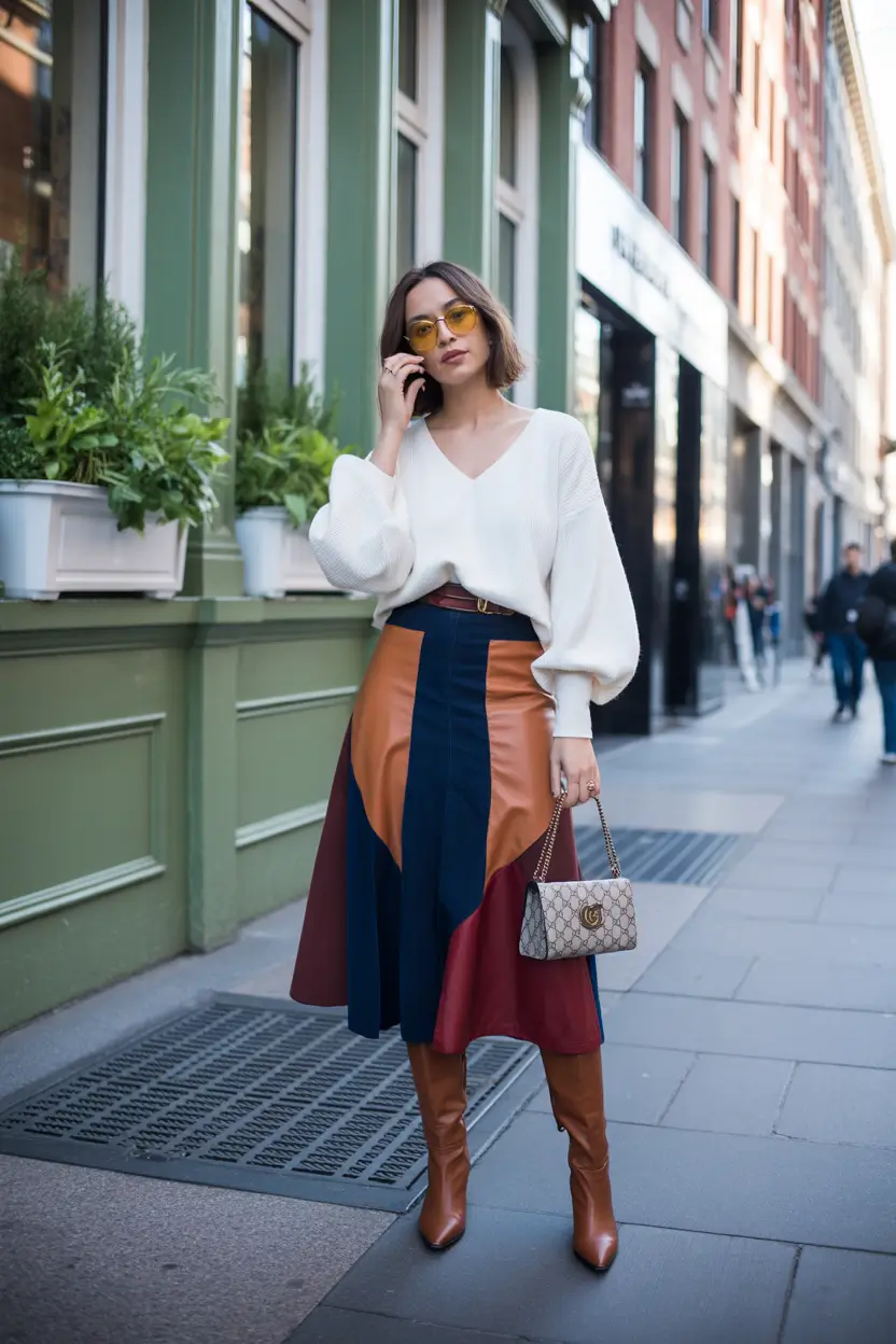 Whenever I encounter a properly executed colorblocking, I feel a little bit of excitement. And this look? Nailed it. The ivory volume-sleeve knit with buttery soft texture contrasts the saturated colors of the panel midi skirt, where the navy, caramel, wine, and brick red colors play together in a perfect harmony. The cognac leather boots that are knee-high drag the look right into the 2025 fall. Throw in a pair of golden-lens sunglasses and a small designer bag and you have a complete 2025 street style crush.
