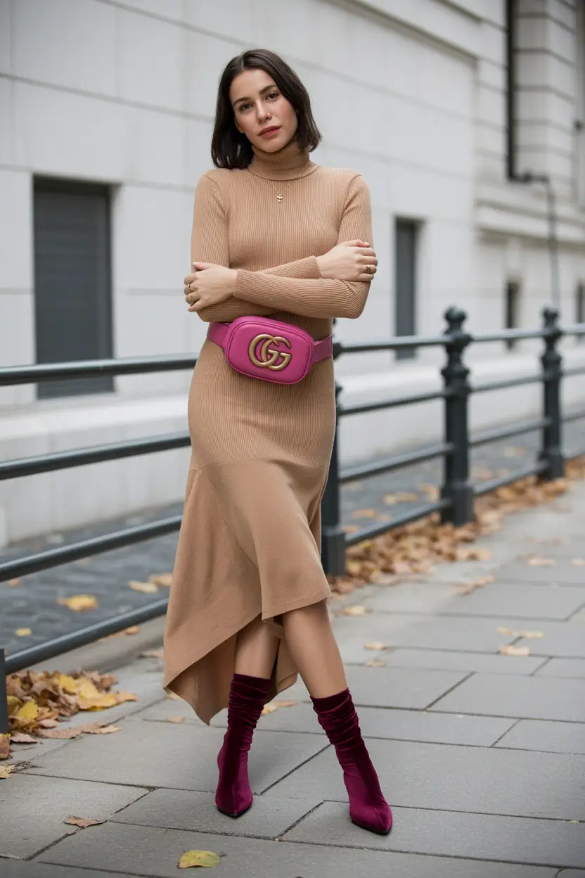 Not every outfit has to scream, some of them speak in a low voice, and then punch. This camel ribbed knit dress is the definition of minimalist perfection as it is so clean at the neckline and asymmetrical hem. But the twist? The fuchsia Gucci belt bag and matching velvet boots. It is as though your most basic took a vacation with a fashion editor. The outcome is strong, tightened and super 2025 primavera ready.