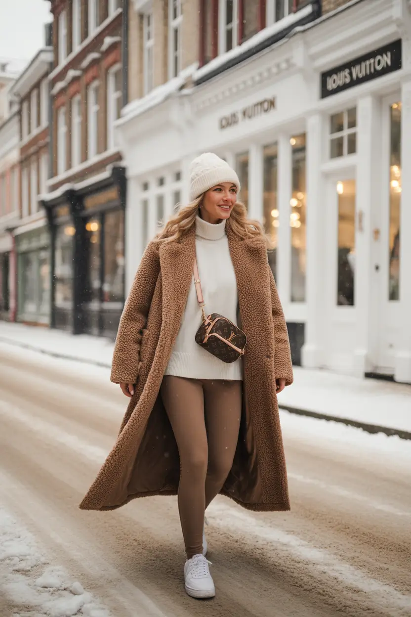 Let’s talk snow. Not only being warm, but being impossibly cute at the same time. The teddy bear coat is the ultimate cozy-core, and it is layered over nude-toned leggings and a chunky knit turtleneck. The rest of the look is completed by beanie and crossbody bag that add a fun and practical touch. And, of course, white sneakers in the snow – as fashion always needs balance. This is a 2025 amazon cool girl going out to run errands but also fully prepared to have a fireside cappuccino.
