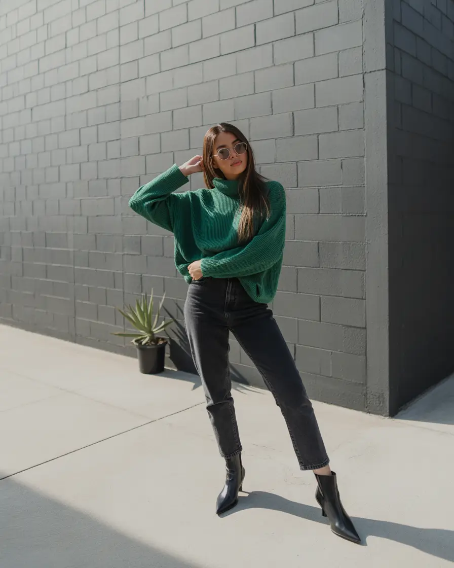There are days when you want to be that girl, sleek, chill and unfussy. And this look delivers. A half-tucked emerald green chunky knit top, washed black high-rise denim and completed with sharp black ankle boots. It’s a vibe. It’s modern. It is what a casual chic is when you have to run errands or get a matcha or shoot a Reel on the go. The pure silhouette allows the color to speak all the words.
