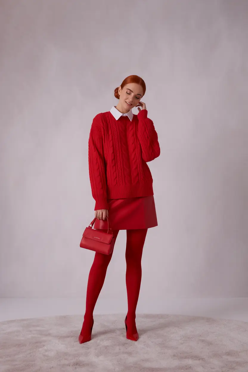 An all over head-to-toe monochrome red outfit may seem daunting at first- but boy does it photograph well. The heavy cable knit, the structured mini, the matching tights, the heels and the handbag are all in the same bright color, so this outfit is a complete hit of 2025 street style. The contrast is provided by the crisp white collar, which keeps it down to earth and preppy.