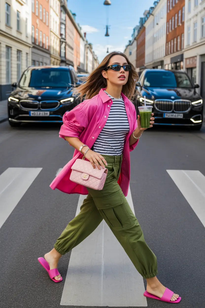 There’s no denying the power of unexpected color pairings. This outfit transforms what would have been a safe outfit of striped tee and utility pant into something fun with a hot pink shirt and matching sandals. The result? The energy of confident, energetic, and very much 2025 primavera. I truly believe that this combination should have its own Pinterest board, it is one of those fashionable fall outfits that are perfect at the beginning of autumn when it is still not so cold and layers are not so heavy.