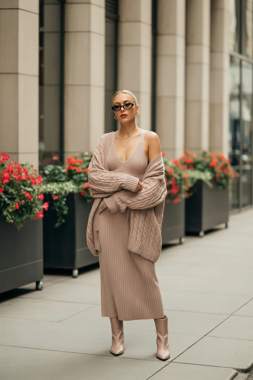 What makes this stand out is the texture play. Knit dress with ribbing, braided weaves on the outerwear and a satin-y finish on those pale champagne boots. These delicate tonal outfits are an enormous component of ideas 2025 and go well with striking accessories, however, in this case, the minimalism is outstanding.
