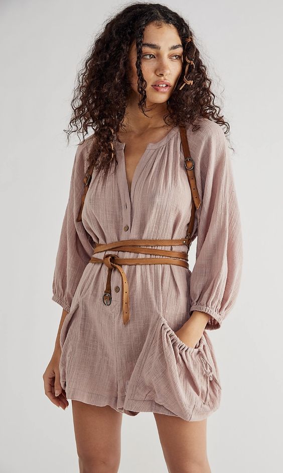 - Braided Belt: Accentuating the waist, the belt with its circular buckle adds a rustic charm and a touch of sophistication.