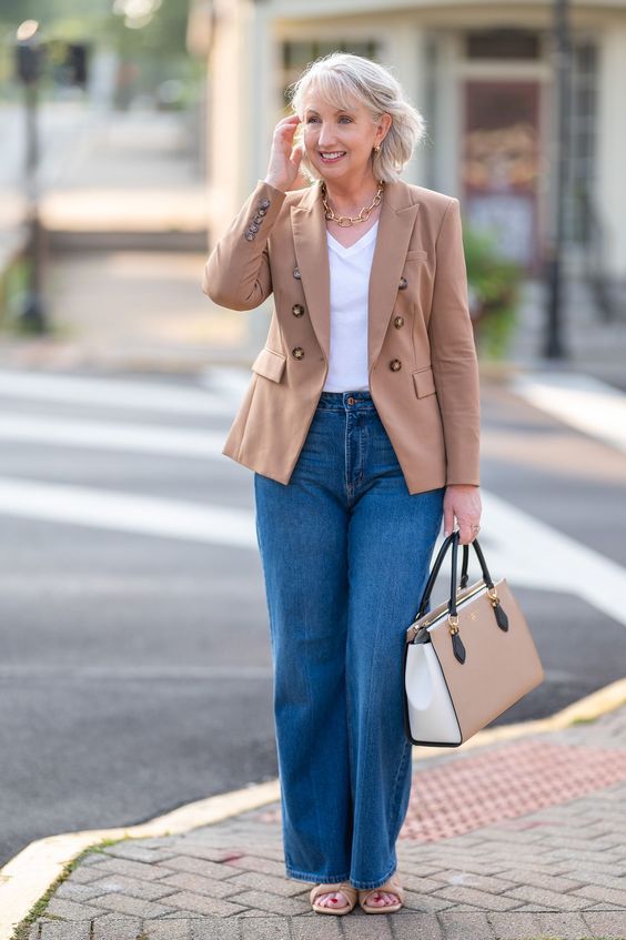 A classic tan blazer paired with timeless blue jeans exemplifies smart casual. The structured jacket adds a layer of sophistication to a simple white tee underneath, while the denim ensures the look remains approachable and relaxed. This outfit is ideal for a young professional striking a balance between serious and playful, perfect for a day in the office or a casual business meeting. The two-tone handbag and delicate sandals add a touch of summer capsule finesse.