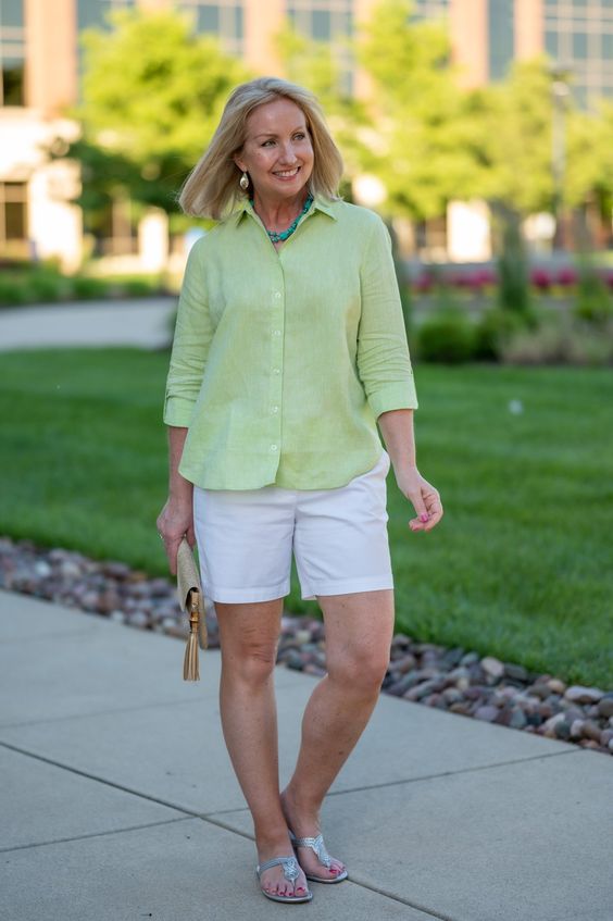 This outfit shines with a lightweight lime green shirt, paired with white shorts for a vibrant, youthful look. It’s an ideal choice for those laid-back vacation resort wear days or even for a fun birthday party. The combination is casual yet polished, with comfortable sandals ready for any summer outing. It’s a celebration of the bold 2024 fashion trends that encourage playful color schemes.
