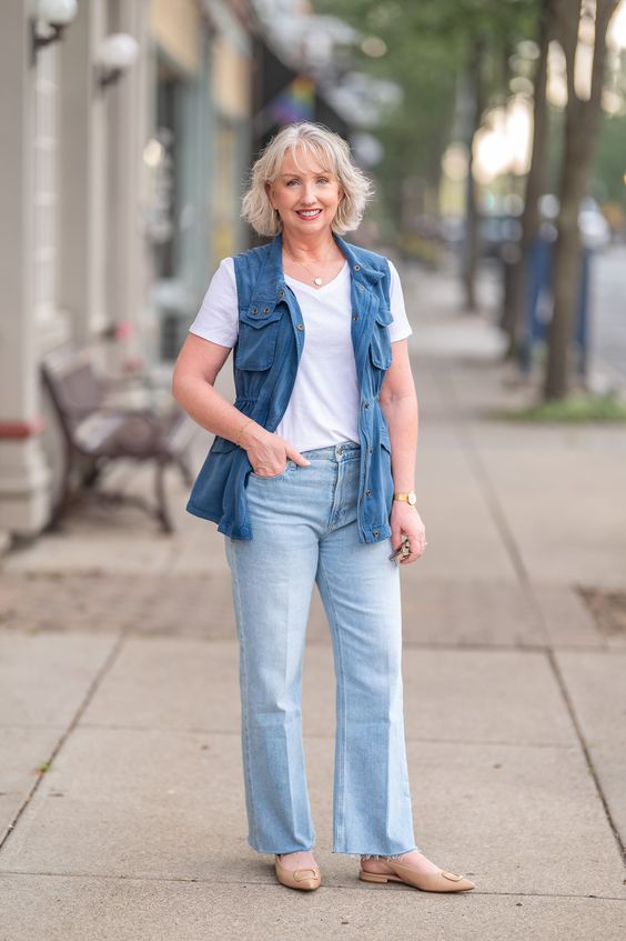 Here we see a wonderful mix of relaxed and chic with a sleeveless denim vest over a classic white tee, complemented by light wash jeans. This ensemble embodies the spirit of casual street styles, suitable for a weekend city break or a casual day out. It’s a nod to the timeless appeal of denim, offering versatility for those in their 40s and beyond.