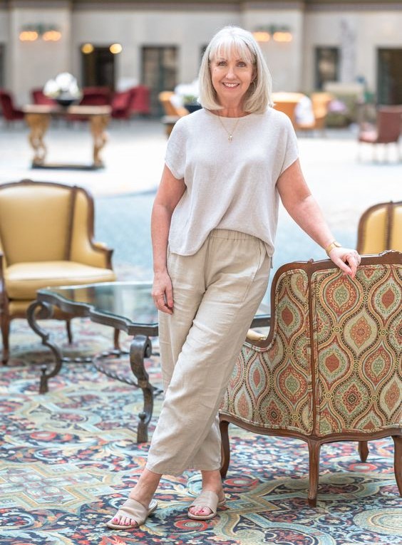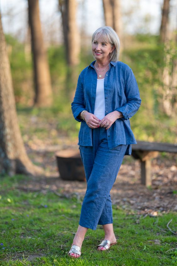 Summer calls for color, and this ensemble delivers with a serene blue sleeveless top, offering a refreshing pop against crisp white linen pants. It’s a capsule wardrobe staple for the woman over 50 embracing the European ease of dressing. The look is accessorized with a chunky gold necklace and a woven handbag, combining casual comfort with a hint of luxury, suitable for a weekend brunch or a seaside stroll.