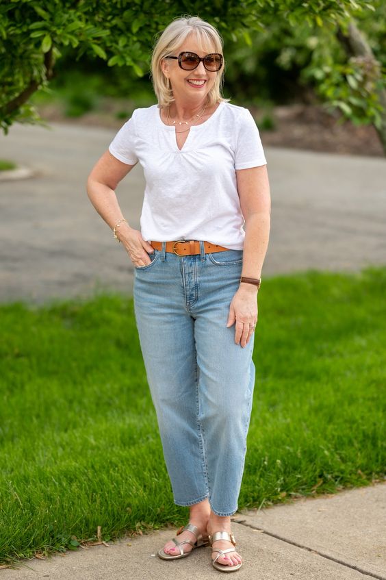 The epitome of timeless style, this ensemble features a classic white t-shirt paired with straight-leg denim jeans. The look is accented with a tan belt and matching wristband, exuding a sense of effortless chic. It’s an outfit that nods to the essentials for a summer capsule, perfect for a casual afternoon or a shopping spree. The simplicity is its strength, offering a canvas for personal expression through accessories and footwear.